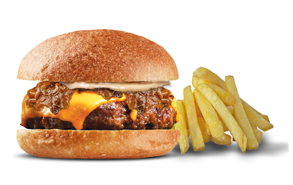 130 gr. Smash Burger Köftesi, GF Sos, Amerikan Cheddar, Karamelize Soğan + Patates