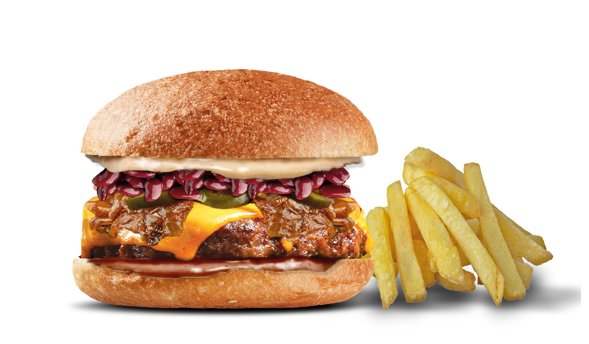 130 gr. Burger Köftesi, GF Sos, Meksika Fasulyesi Acı Sos, Jalapeno Biber, Karamelize Soğan + Patates
